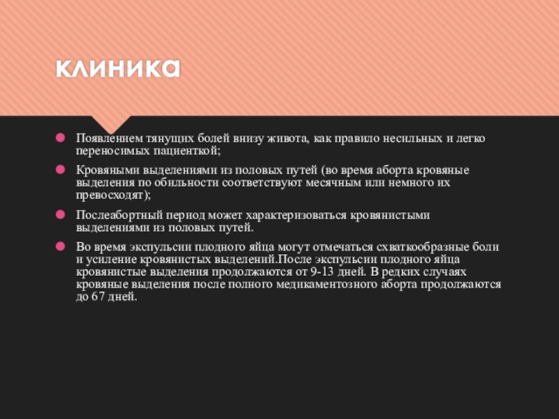 Во время экспульсии плодного яйца могут отмечаться схваткообразные боли и усиление кровянистых выделений.После экспульсии плодного яйца кровянистые выделения продолжаются от 9-13 дней. В редких случаях кровяные выделения после полного медикаментозного аборта продолжаются до 67 дней.