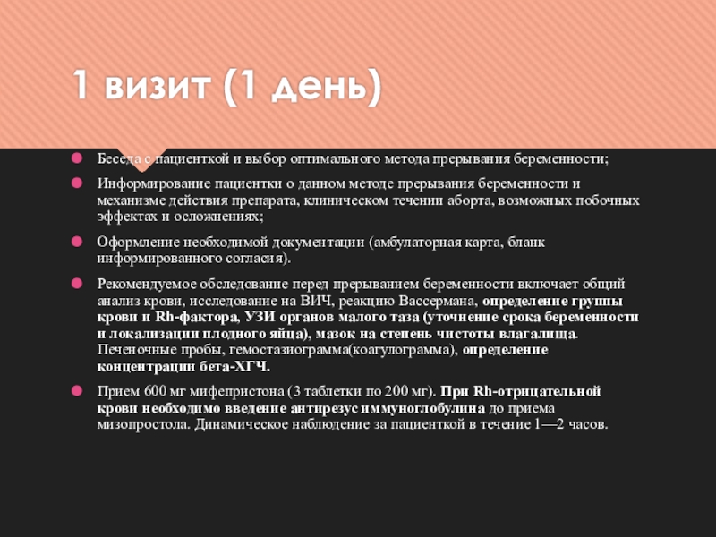 Прием 600 мг мифепристона (3 таблетки по 200 мг). При Rh-отрицательной крови необходимо введение антирезус иммуноглобулина до приема мизопростола. Динамическое наблюдение за пациенткой в течение 1—2 часов.
