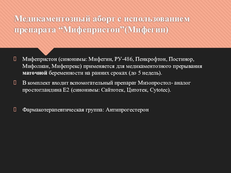 Слайд 5Медикаментозный аборт с использованием препарата “Мифепристон”(Мифегин)