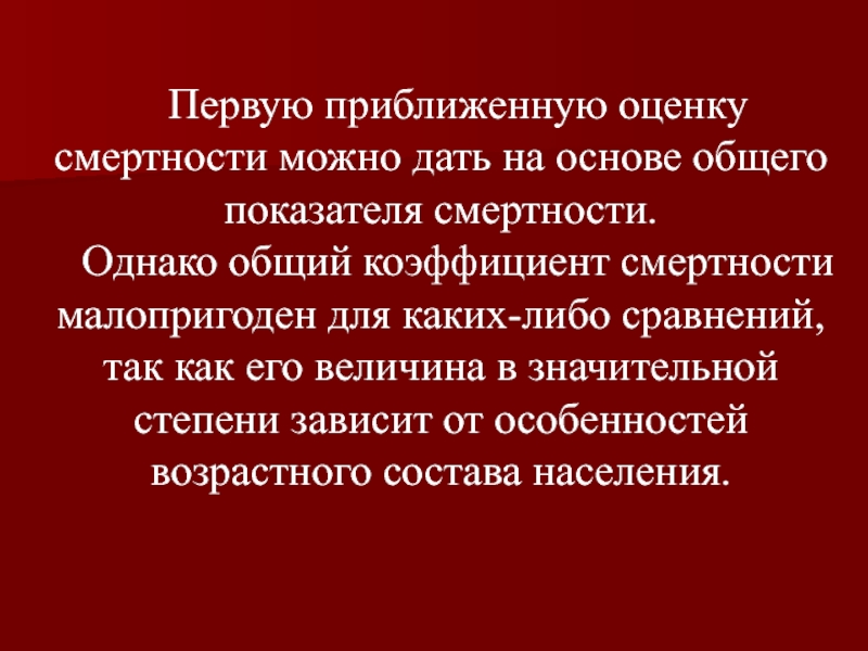 Слайд 25Первую приближенную оценку смертности можно дать на основе общего показателя смертности.