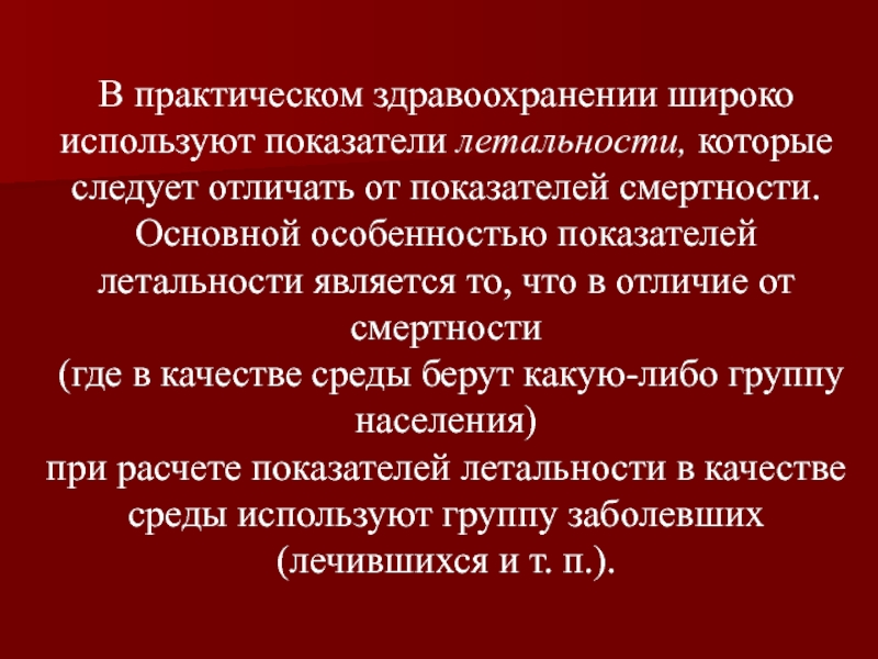 Слайд 28В практическом здравоохранении широко используют показатели летальности, которые следует отличать от