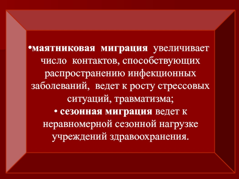 Слайд 18маятниковая миграция увеличивает число контактов, способствующих распространению инфекционных заболеваний,