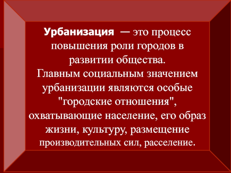 значением урбанизации являются особые "городские отношения", охватывающие население, его образ