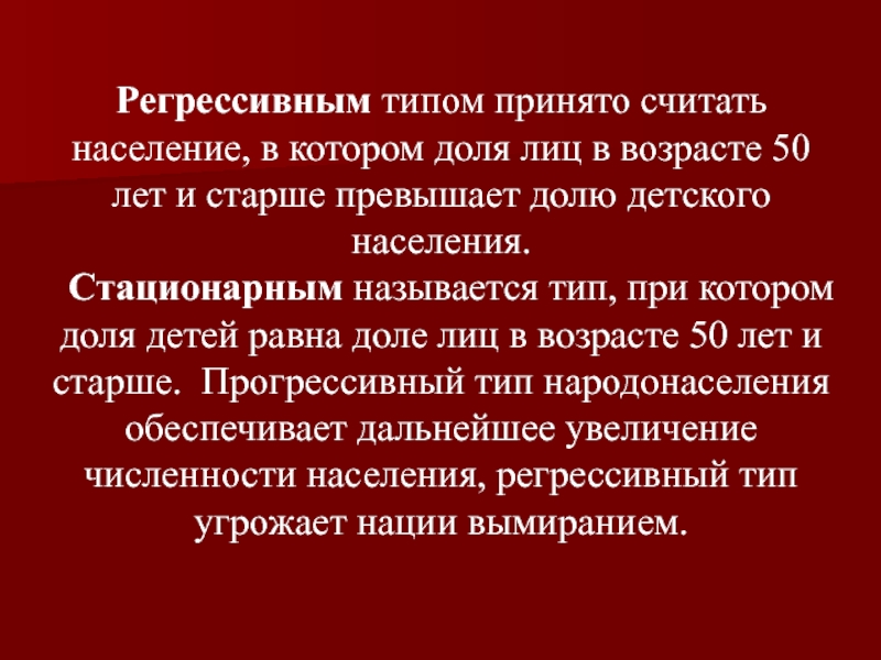 Стационарным называется тип, при котором доля детей равна доле лиц в возрасте 50 лет и старше. Прогрессивный тип народонаселения обеспечивает дальнейшее увеличение численности населения, регрессивный тип угрожает нации вымиранием.