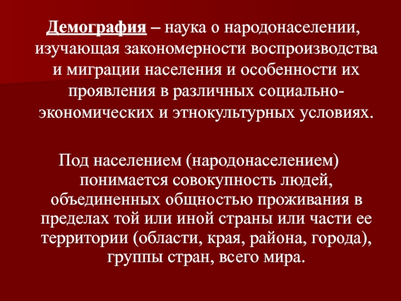 Под населением (народонаселением) понимается совокупность людей, объединенных общностью проживания в пределах той или иной страны или части ее территории (области, края, района, города), группы стран, всего мира.