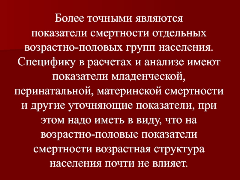 Слайд 26Более точными являются показатели смертности отдельных возрастно-половых групп населения.