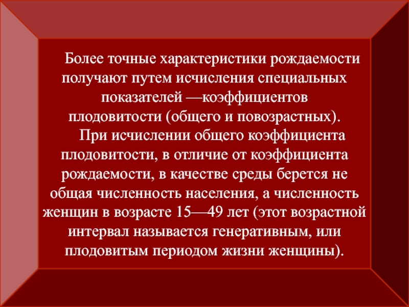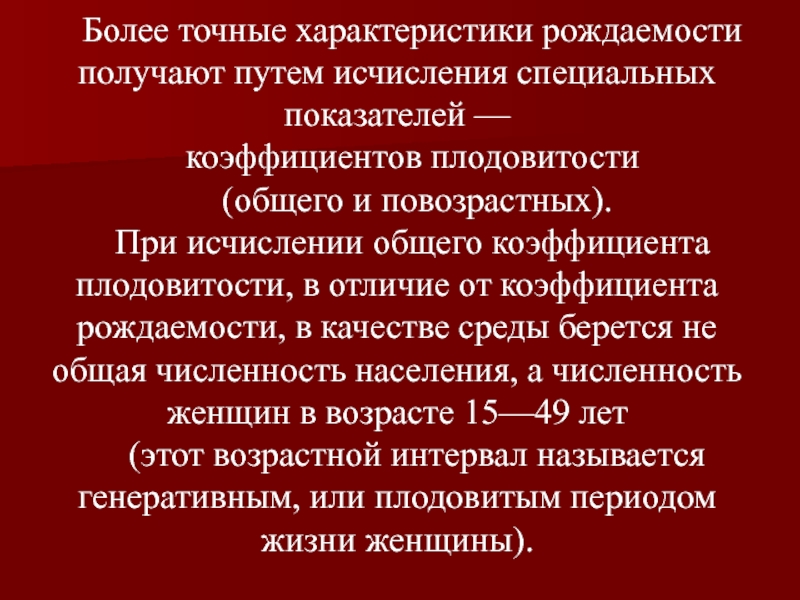 от коэффициента рождаемости, в качестве среды берется не общая численность населения, а численность женщин в возрасте 15—49 лет (этот возрастной интервал называется генеративным, или плодовитым периодом жизни женщины).