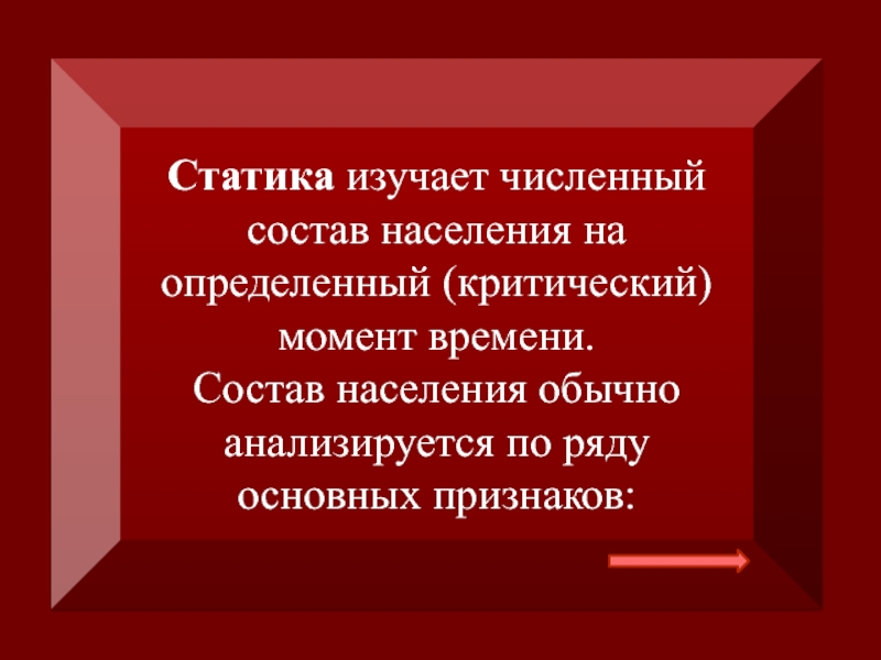 Слайд 5Статика изучает численный состав населения на определенный (критический) момент времени.