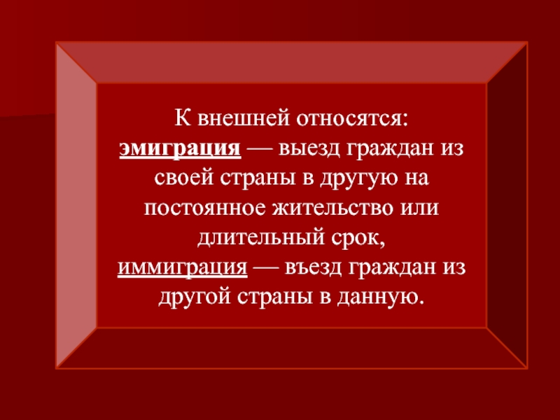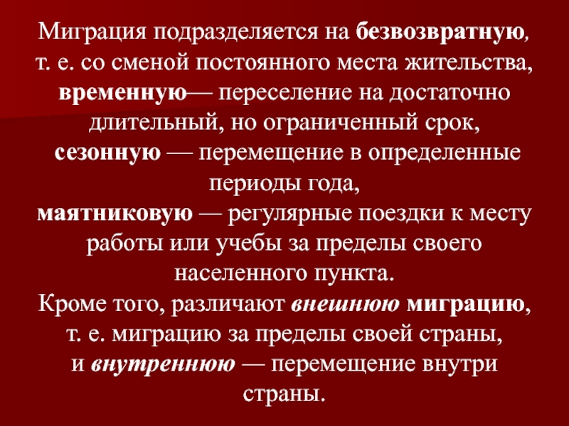 Кроме того, различают внешнюю миграцию, т. е. миграцию за пределы своей страны, и внутреннюю — перемещение внутри страны.