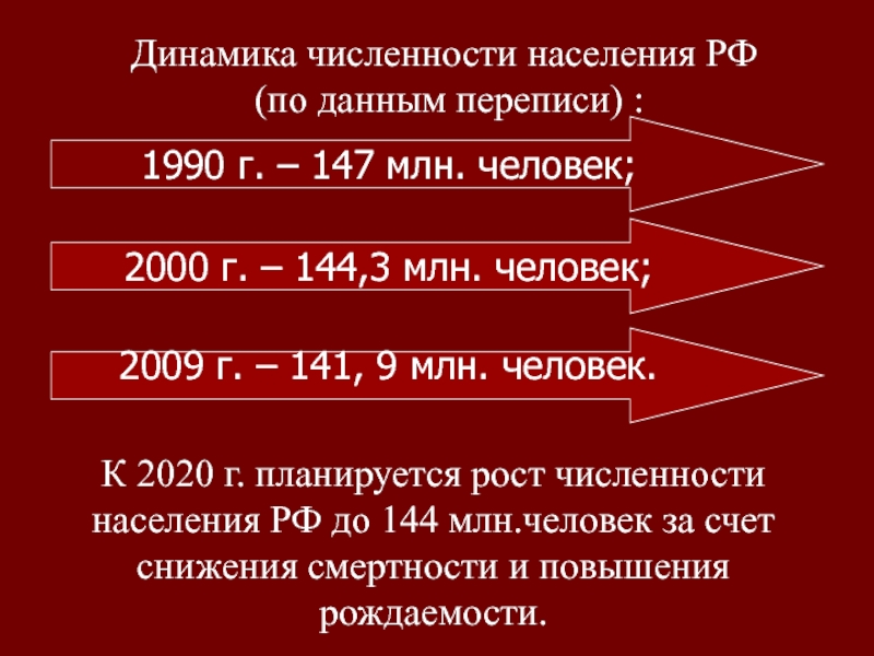 К 2020 г. планируется рост численности населения РФ до 144 млн.человек за счет снижения смертности и повышения рождаемости.