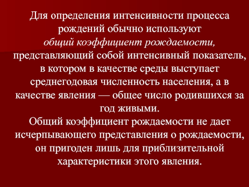 Общий коэффициент рождаемости не дает исчерпывающего представления о рождаемости, он пригоден лишь для приблизительной характеристики этого явления.