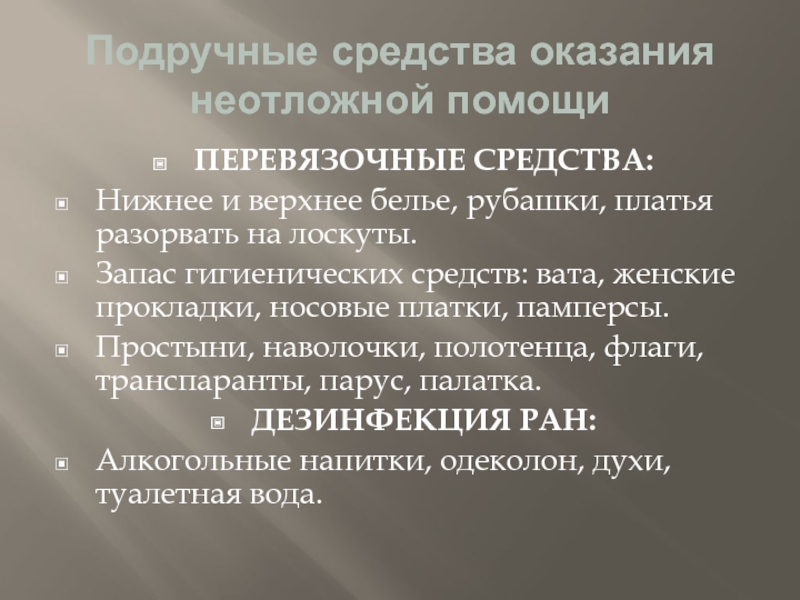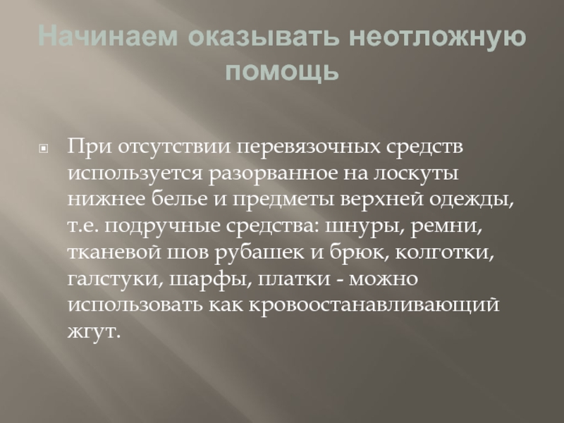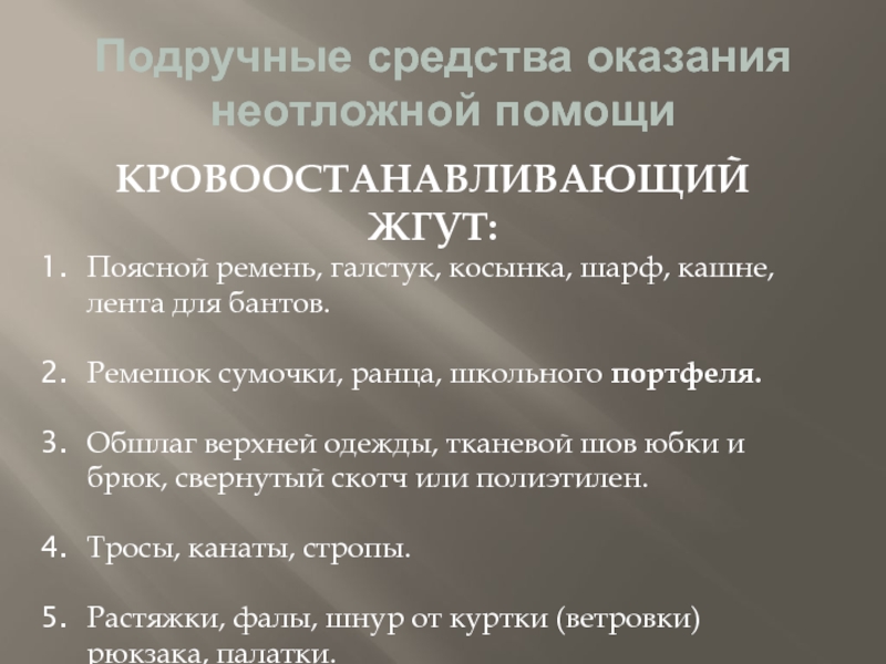 шнуры, ремни, тканевой шов рубашек и брюк, колготки, галстуки, шарфы, платки - можно использовать как кровоостанавливающий жгут.