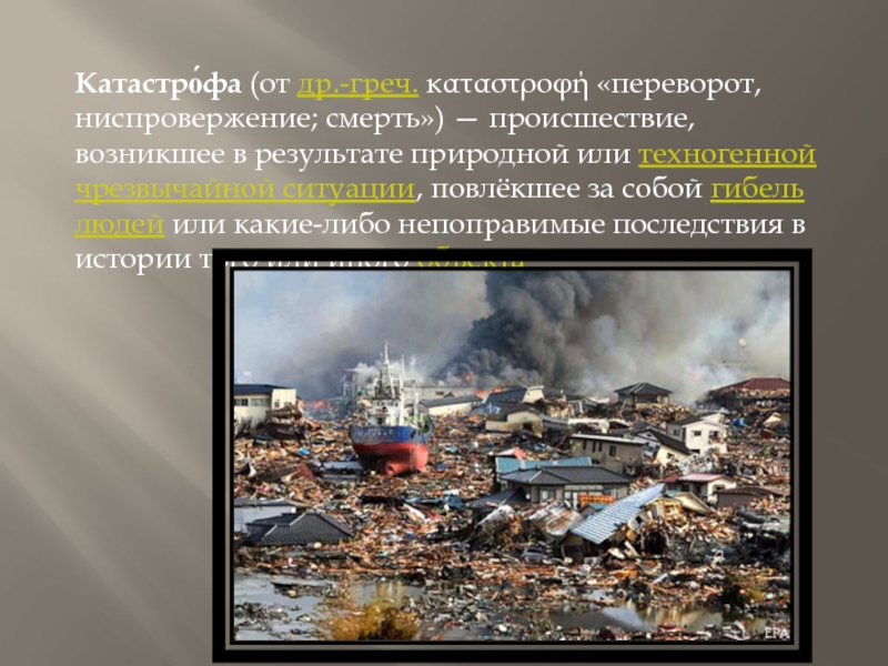 Слайд 2Катастро́фа (от др.-греч. καταστροφή «переворот, ниспровержение; смерть») — происшествие, возникшее в