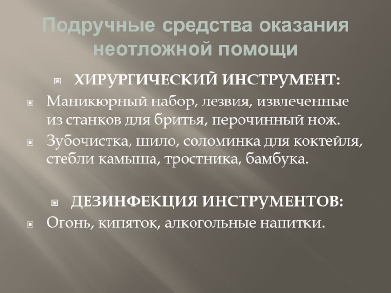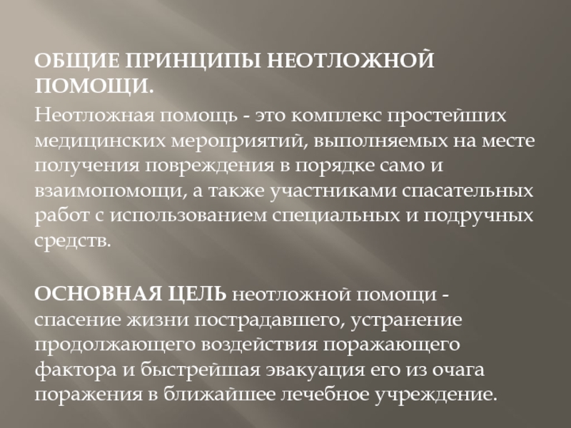 ОСНОВНАЯ ЦЕЛЬ неотложной помощи - спасение жизни пострадавшего, устранение продолжающего воздействия поражающего фактора и быстрейшая эвакуация его из очага поражения в ближайшее лечебное учреждение.