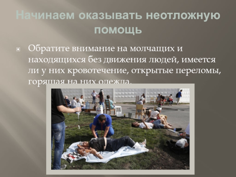Причем не тем, кто кричит, шумит и взывает о помощи (они в сознании и могут самостоятельно оказать себе помощь или подождать).