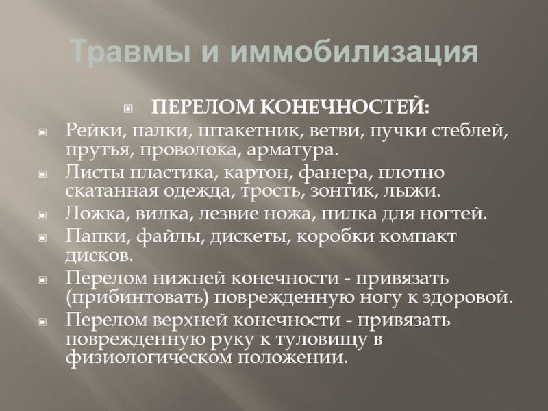 Перелом верхней конечности - привязать поврежденную руку к туловищу в физиологическом положении.