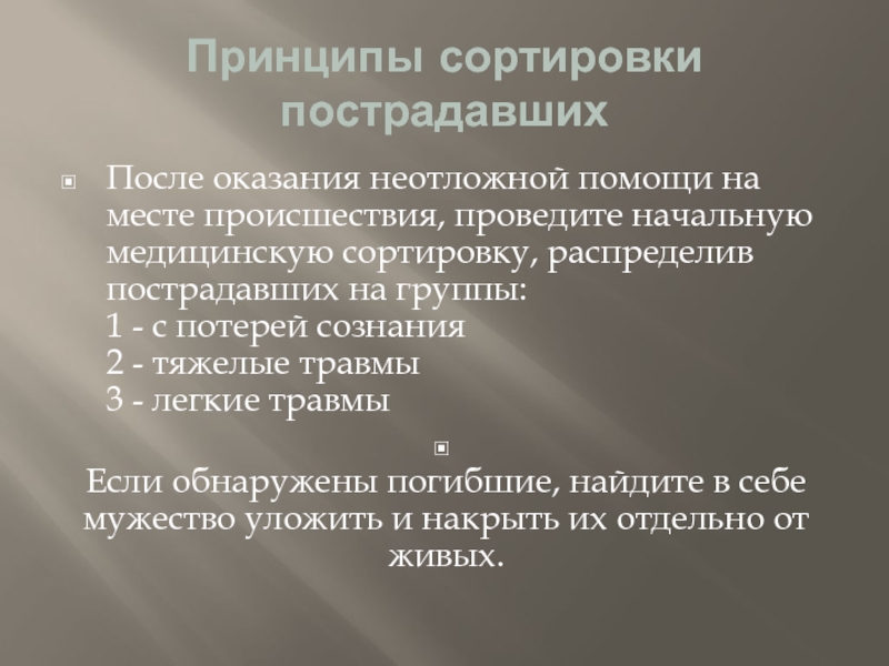 Если обнаружены погибшие, найдите в себе мужество уложить и накрыть их отдельно от живых.
