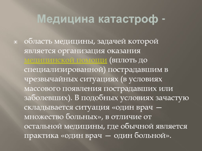 массового появления пострадавших или заболевших). В подобных условиях зачастую складывается ситуация «один врач — множество больных», в отличие от остальной медицины, где обычной является практика «один врач — один больной».