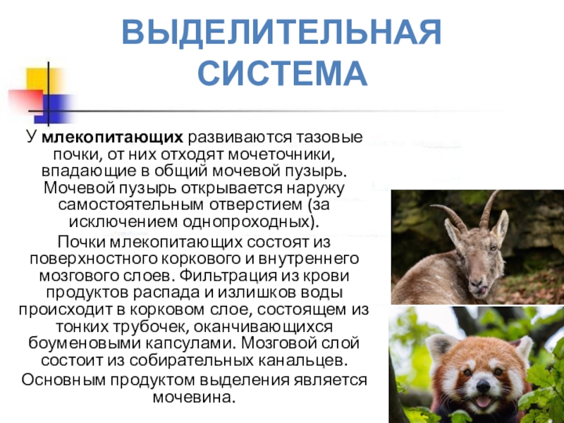 У млекопитающих развиваются тазовые почки, от них отходят мочеточники,