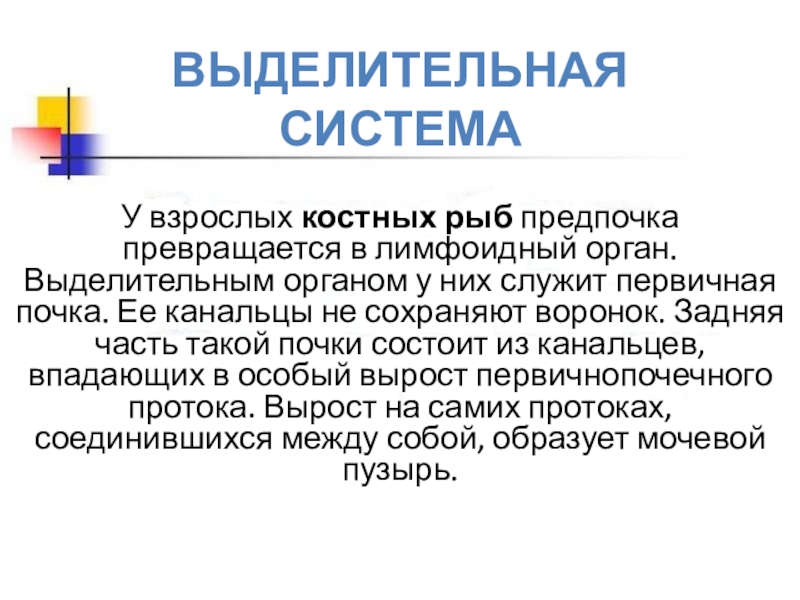У взрослых костных рыб предпочка превращается в лимфоидный орган. Выделительным органом