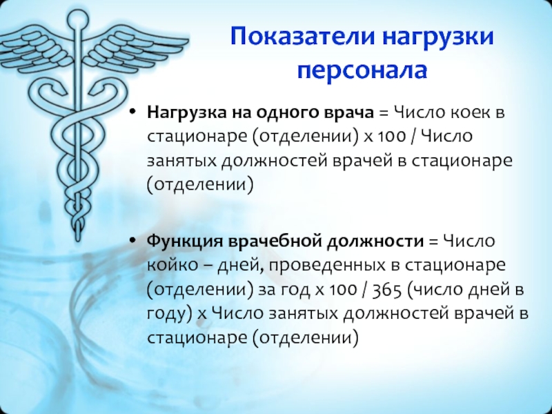 Показатель характеризует объем деятельности стационара и эффективность использования коечного фонда. Работа койки меньше или больше норматива свидетельствует соответственно о недогрузке или перегрузке стационара. На использование койки в различных стационарах и по различным профилям влияют многочисленные факторы: госпитализация непрофильных больных, поступление плановых больных в субботу и воскресенье, выписка больных в предпраздничные и праздничные дни, догоспитальное амбулаторное обследование больных в стационаре, несвоевременное назначение диагностических исследований и комплексного лечения, несвоевременная выписка из стационара и др.