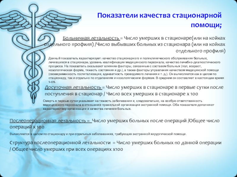 Смерть в первые сутки указывает на тяжесть заболевания и, следовательно, на особую ответственность медицинского персонала в отношении правильной организации экстренной помощи. Оба показателя дополняют характеристику организации и качества лечения больных.