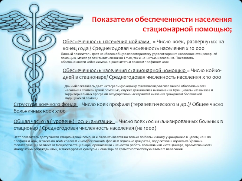 Данный показатель дает интегральную оценку фактически реализованной обеспеченности населения стационарной помощью, служит для анализа выполнения муниципальных заказов и территориальных программ государственных гарантий оказания гражданам бесплатной медицинской помощи.