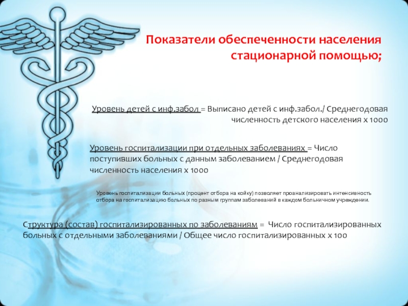 Этот показатель доступности стационарной помощи и рассчитывается не только по больничному учреждению в целом, но и по профилям коек, а также по всем классам и нозологическим формам отдельно для детей, подростков и взрослых. Уровень госпитализации зависит от мощности стационара, организации и качества работы поликлиники и стационара, преемственности между этими учреждениями, а также уровня культуры и санитарной грамотности обслуживаемого населения.