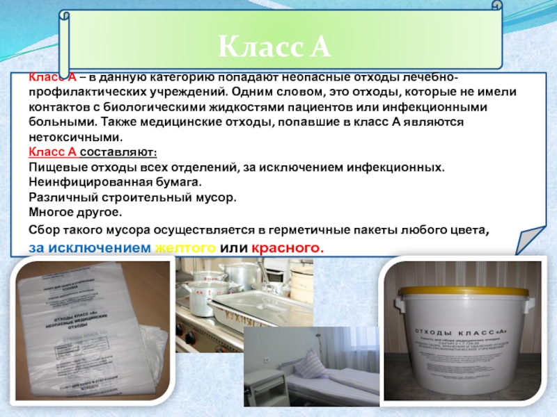 Слайд 7Класс А – в данную категорию попадают неопасные отходы лечебно-профилактических