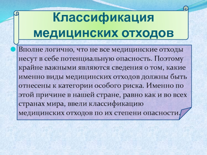 том, какие именно виды медицинских отходов должны быть отнесены к категории особого риска. Именно по этой причине в нашей стране, равно как и во всех странах мира, ввели классификацию медицинских отходов по их степени опасности.