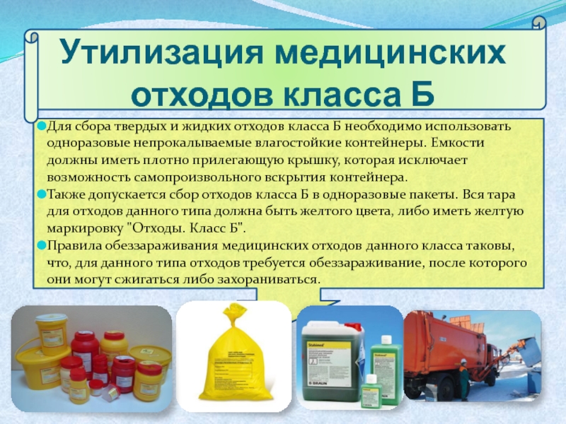 класса Б необходимо использовать одноразовые непрокалываемые влагостойкие контейнеры. Емкости должны