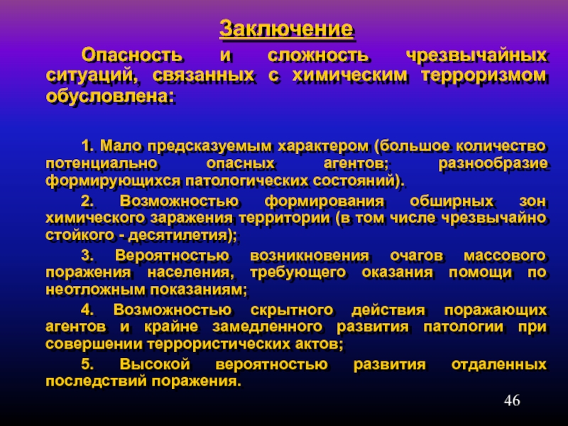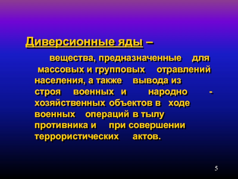 4. Возможностью скрытного действия поражающих агентов и крайне замедленного развития патологии при совершении террористических актов;
