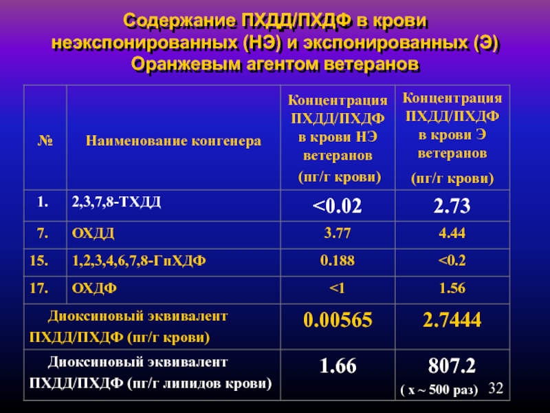 Слайд 32Содержание ПХДД/ПХДФ в крови неэкспонированных (НЭ) и экспонированных (Э) Оранжевым