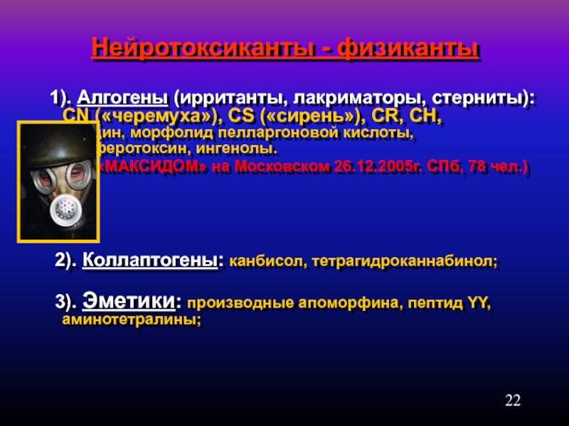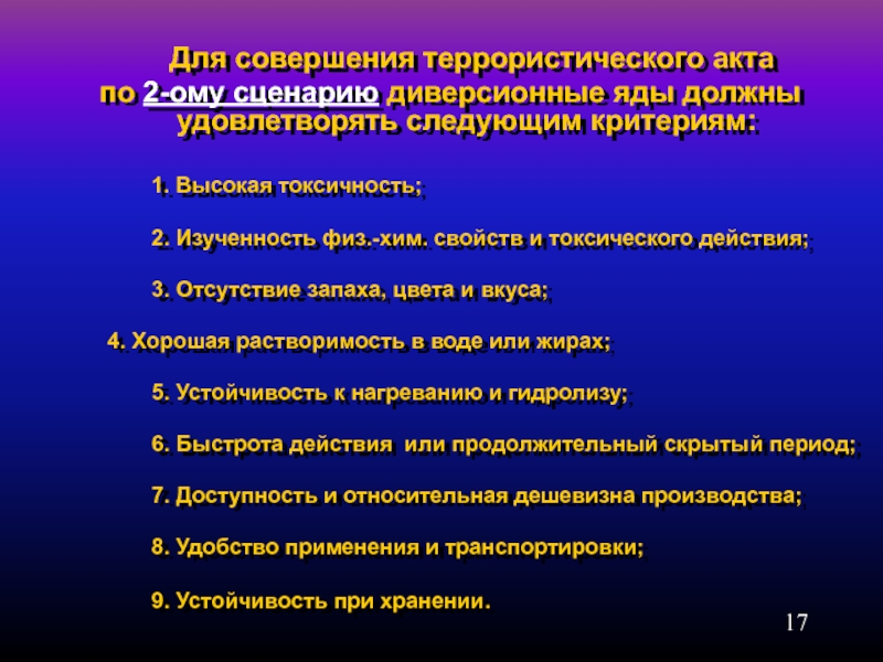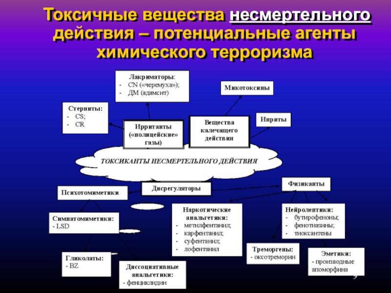 Слайд 9 Токсичные вещества несмертельного действия – потенциальные агенты химического терроризма