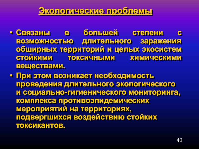 необходимость проведения длительного экологического и социально-гигиенического мониторинга, комплекса противоэпидемических мероприятий на территориях, подвергшихся воздействию стойких токсикантов.