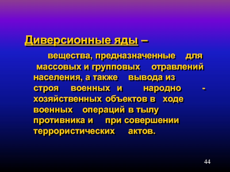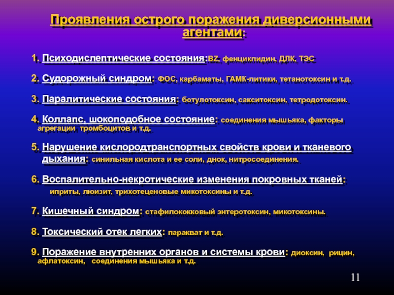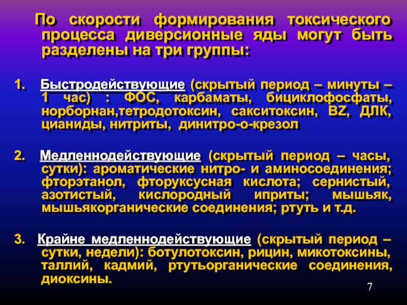 Слайд 7 По скорости формирования токсического процесса диверсионные яды могут быть разделены