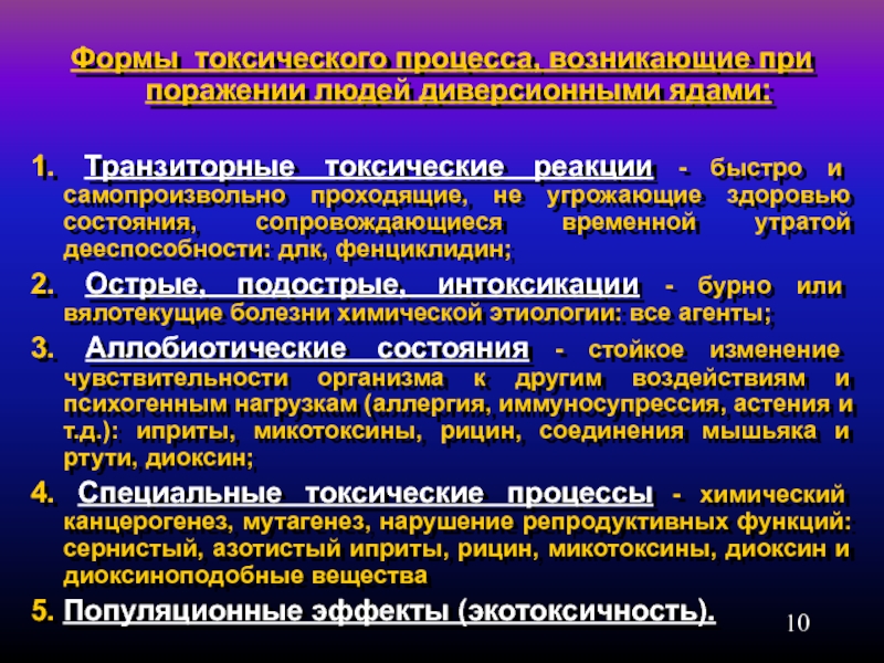 3. Аллобиотические состояния - стойкое изменение чувствительности организма к другим воздействиям и психогенным нагрузкам (аллергия, иммуносупрессия, астения и т.д.): иприты, микотоксины, рицин, соединения мышьяка и ртути, диоксин;