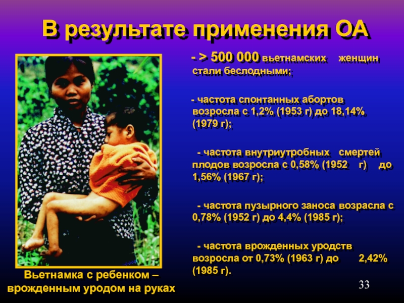 - частота врожденных уродств возросла от 0,73% (1963 г) до 2,42% (1985 г).