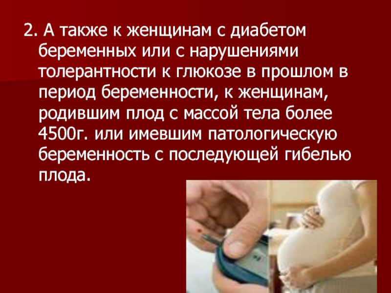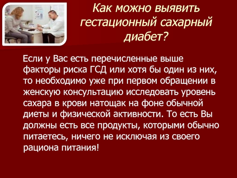 из них, то необходимо уже при первом обращении в женскую консультацию исследовать уровень сахара в крови натощак на фоне обычной диеты и физической активности. То есть Вы должны есть все продукты, которыми обычно питаетесь, ничего не исключая из своего рациона питания!
