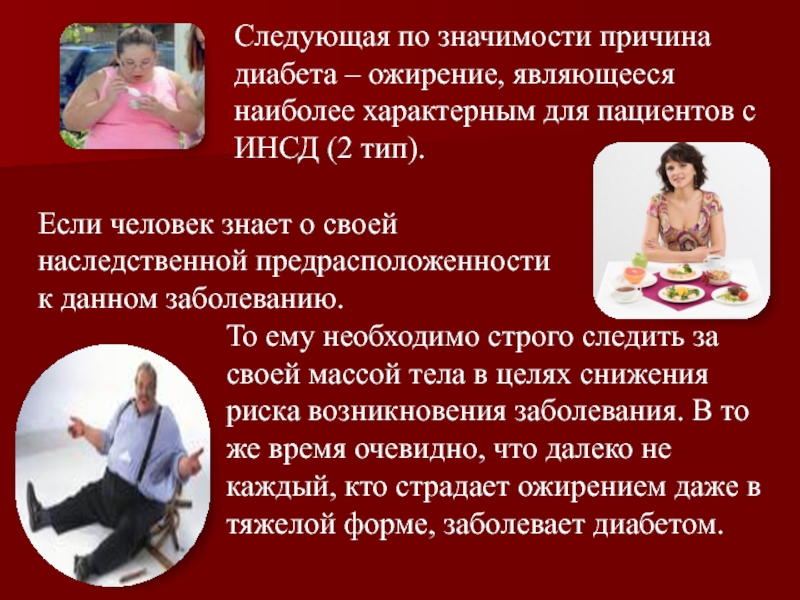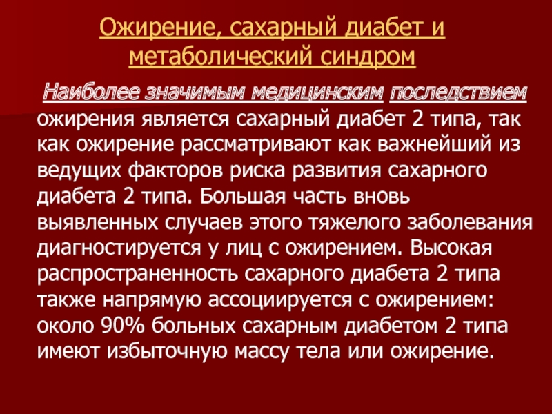 рассматривают как важнейший из ведущих факторов риска развития сахарного диабета 2 типа. Большая часть вновь выявленных случаев этого тяжелого заболевания диагностируется у лиц с ожирением. Высокая распространенность сахарного диабета 2 типа также напрямую ассоциируется с ожирением: около 90% больных сахарным диабетом 2 типа имеют избыточную массу тела или ожирение.