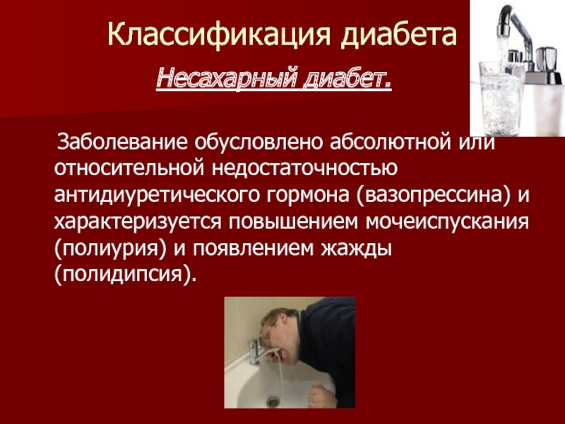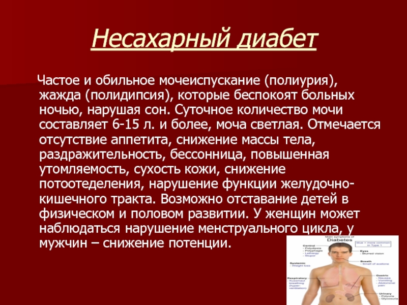 относительной недостаточностью антидиуретического гормона (вазопрессина) и характеризуется повышением мочеиспускания (полиурия)