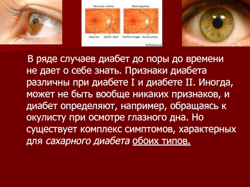 I и диабете II. Иногда, может не быть вообще никаких признаков, и диабет определяют, например, обращаясь к окулисту при осмотре глазного дна. Но существует комплекс симптомов, характерных для сахарного диабета обоих типов.