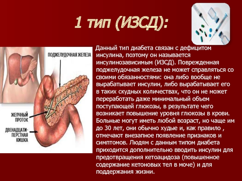 не может справляться со своими обязанностями: она либо вообще не вырабатывает инсулин, либо вырабатывает его в таких скудных количествах, что он не может переработать даже минимальный объем поступающей глюкозы, в результате чего возникает повышение уровня глюкозы в крови. Больные могут иметь любой возраст, но чаще им до 30 лет, они обычно худые и, как правило , отмечают внезапное появление признаков и симптомов. Людям с данным типом диабета приходится дополнительно вводить инсулин для предотвращения кетоацидоза (повышенное содержание кетоновых тел в моче) и для поддержания жизни.