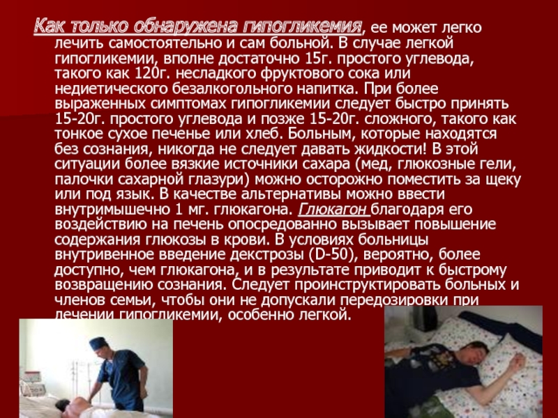 Слайд 58Как только обнаружена гипогликемия, ее может легко лечить самостоятельно и