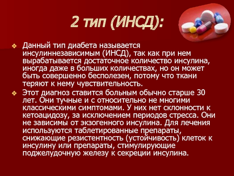 Этот диагноз ставится больным обычно старше 30 лет. Они тучные и с относительно не многими классическими симптомами. У них нет склонности к кетоацидозу, за исключением периодов стресса. Они не зависимы от экзогенного инсулина. Для лечения используются таблетированные препараты, снижающие резистентность (устойчивость) клеток к инсулину или препараты, стимулирующие поджелудочную железу к секреции инсулина.