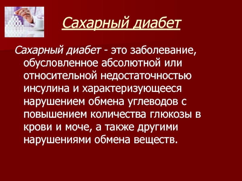 Сахарный диабет - это заболевание, обусловленное абсолютной или относительной