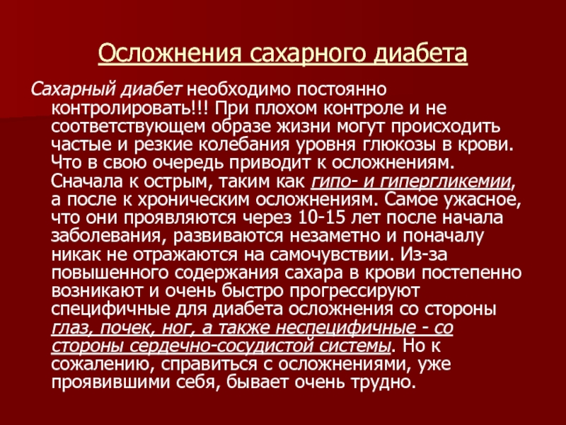 7. Вы должны иметь представление об острых и хронических осложнениях, которые развиваются при диабете.