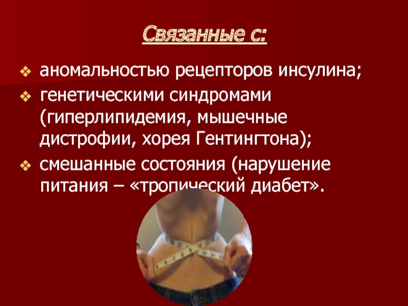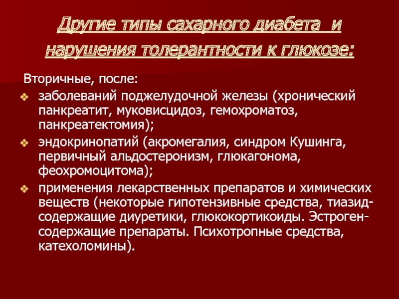 Слайд 15Другие типы сахарного диабета и нарушения толерантности к глюкозе: