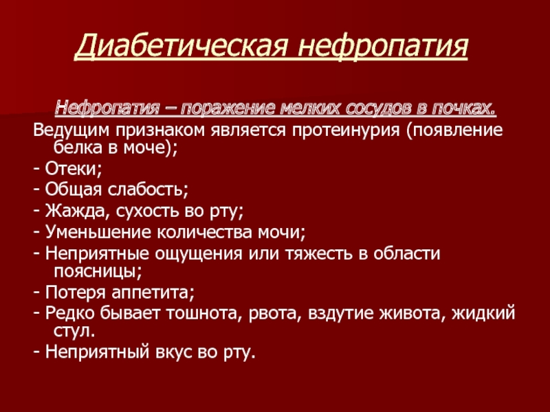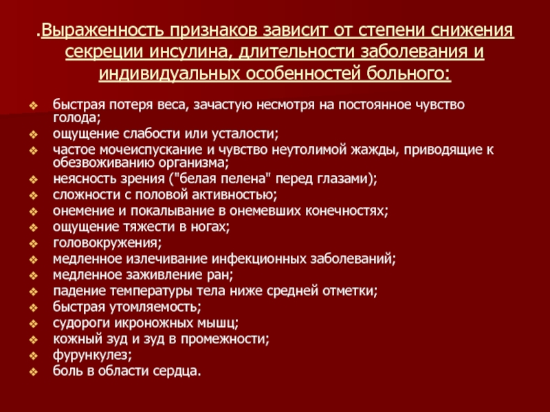 Слайд 18.Выраженность признаков зависит от степени снижения секреции инсулина, длительности заболевания