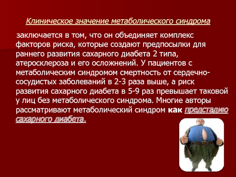 развития сахарного диабета 2 типа, атеросклероза и его осложнений. У пациентов с метаболическим синдромом смертность от сердечно-сосудистых заболеваний в 2-3 раза выше, а риск развития сахарного диабета в 5-9 раз превышает таковой у лиц без метаболического синдрома. Многие авторы рассматривают метаболический синдром как предстадию сахарного диабета.